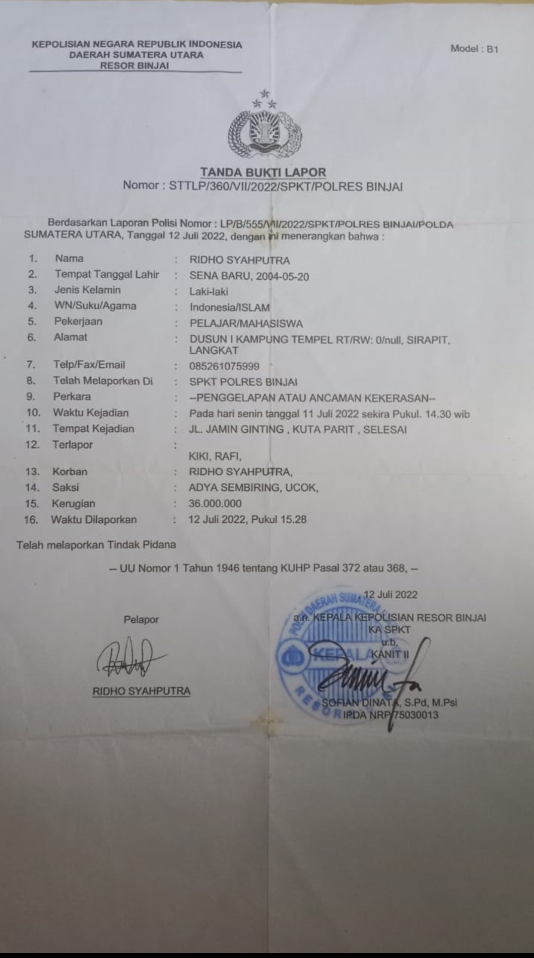 Karena tak terima kendaran roda dua miliknya dirampas, Ridho kemudian melaporkan Rafi dan Kiki ke Mapolres Binjai pada Selasa (12 Juli 2022) pukul 15:28 Wib dengan bukti surat Nomor: STTLP/360/VII/2022/SPKT/Polres Binjai.